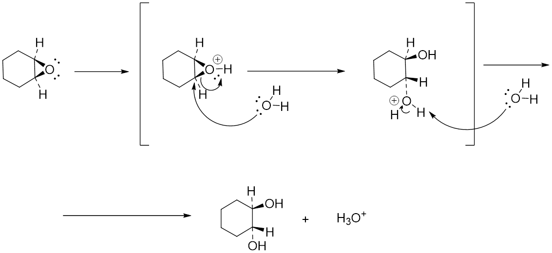 エポキシドの酸触媒開裂はエポキシドのプロトン化で反応性が増大し、続いて水が求電子付加することによっておこる。この方法は後述する四酸化オスミウムによるジオールの生成反応と相補的である。